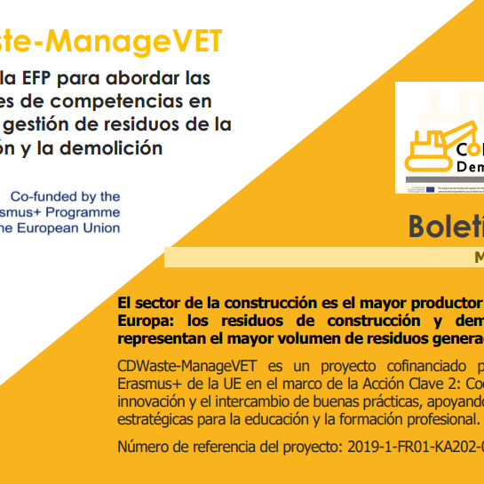 CDWaste-ManageVET desarrollo de la Educación y Formación Profesional -EFP- para abordar las necesidades de competencias en gestión de residuos de construcción y demolición» es un proyecto cofinanciado por el Programa Erasmus+ de la Unión Europea (UE), en el marco de la Acción Clave 2: Cooperación para la innovación y el intercambio de buenas prácticas, que apoya las Asociaciones Estratégicas para la educación y la formación profesional.